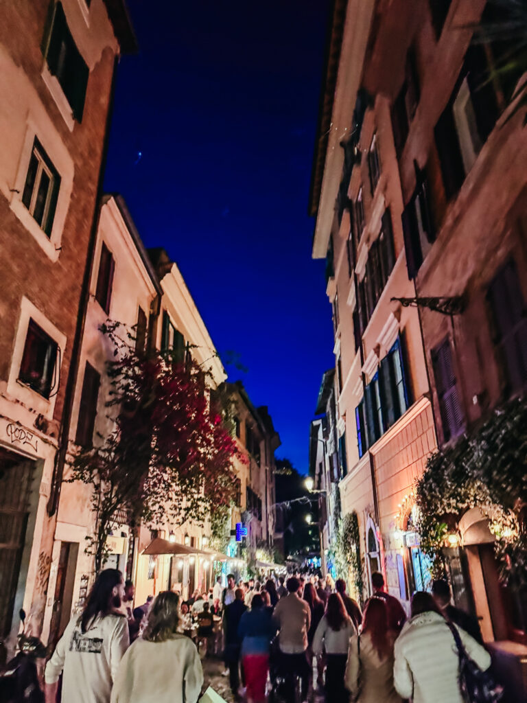 Bohemiskt, charmigt och fullt av slingrande kullerstensgator, tvättlinor och små trattorior. Här hittar du Roms hjärta – bäst på kvällstid när gränderna vaknar till liv. Det är inte på måttligt vis numera, dock. Förvänta dig mycket turister och direkt trängsel i gränderna.